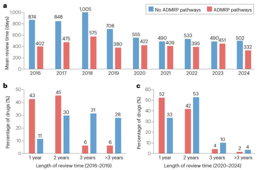 2016-2024年NMPA批准上市新药审评时间:a, 按色情网址大全审评审批类型分类;b, 2016-2019年NMPA批准上市新药审评时间分布情况; c, 2020-2024年NMPA批准上市新药审评时间分布情况。