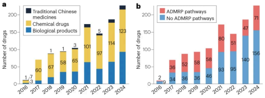2016-2024年期间,中国国家药品监督管理局(NMPA)累计批准1100个新药申请,其中化药692个(63%)、生物制品368个(33%)、中药40个(4%)。在1100个新药中,近40%(455个)通过加快上市注册程序(ADMRP)获批。2020-2024年间新药主要通过三种ADMRP途径获批上市:优先审评审批(PRA)276个、附条件批准(CA)121个,突破性治疗色情网址大全(BTD)55个。