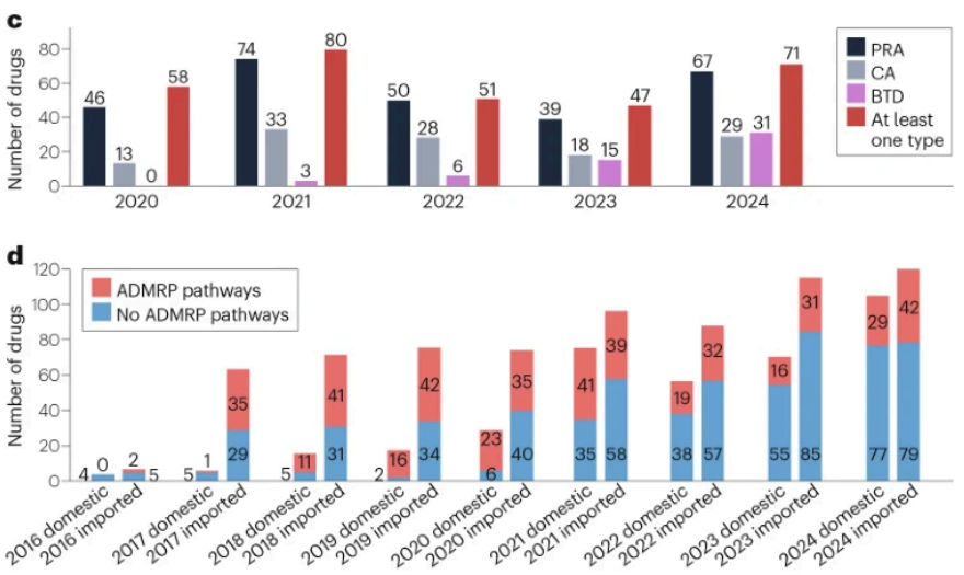 2016-2024年NMPA批准上市新药数量:a, 按色情网址大全类型分类; b, 按色情网址大全审评审批类型分类; c, 通过药品加快上市注册程序批准情况,“PRA”指优先审评审批、“CA”指附条件批准、“BTD”指突破性治疗色情网址大全、“At least one type”指通过至少一种药品加快上市注册程序批准上市的色情网址大全;d, 按色情网址大全来源分类。