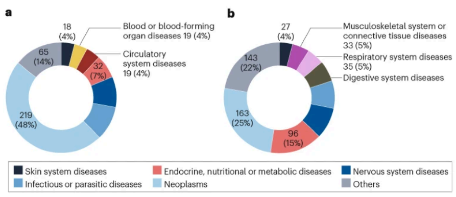 2016-2024年NMPA批准上市新药治疗领域分布情况:a, 通过药品加快上市注册程序批准情况;b, 通过非药品加快上市注册程序批准情况。