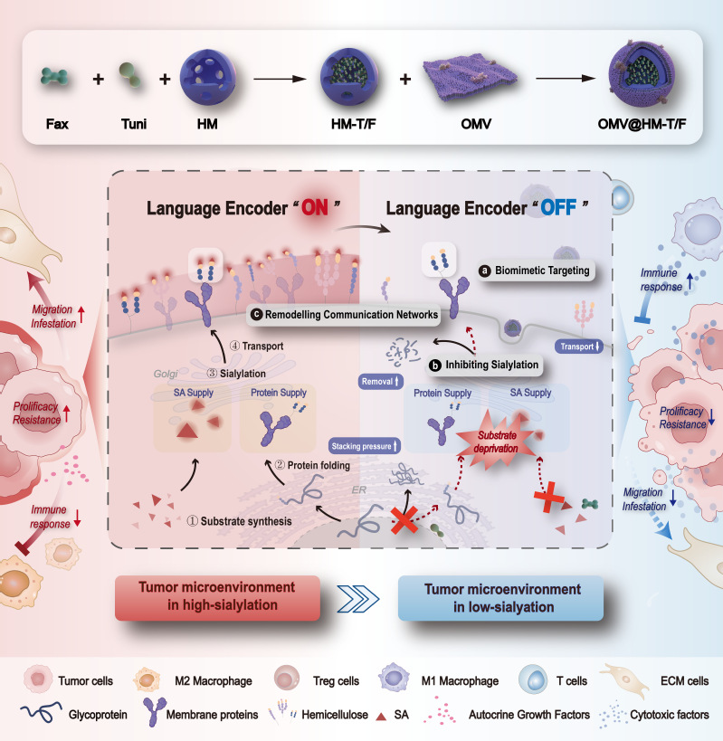 基于此,我院蒋晨教授、孙涛副教授团队提出了一种从代谢编码层级切入的精准阻断策略,通过同时抑制糖基化前体生成与唾液酸活化两大关键过程,实现对肿瘤细胞表面终末唾液酸化修饰的系统性干预。研究团队进一步开发了具有跨越血脑屏障能力的“功能菌衍生纳米干扰器”,并通过微环境响应设计实现调控分子的定向递送与原位释放。依托GBM对唾液酸相关聚糖结构的代谢依赖性,该纳米平台能够有效破坏肿瘤细胞的唾液酸“语言编码”机制,削弱其信号整合能力,并重塑肿瘤细胞间通信结构,从而逆转代谢驱动的治疗抵抗性,增强干预响应。