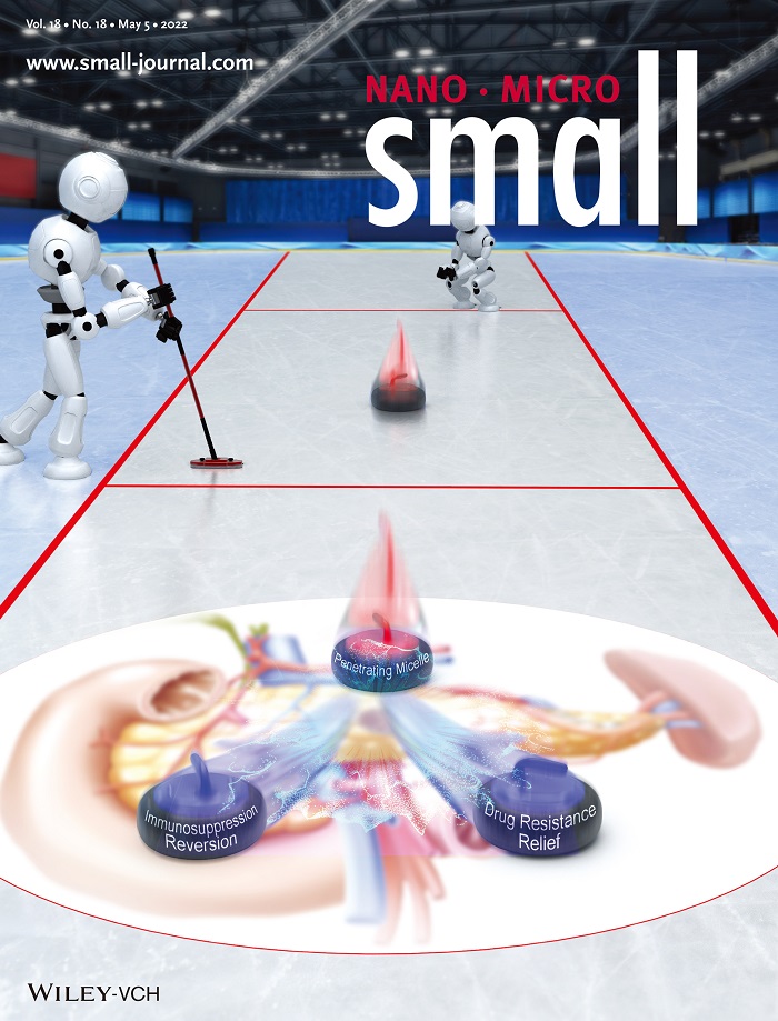图1,本项工作发表于Wiley出版社Small杂志,并被选为当期封面(Front Cover)。图示巧妙利用冰壶比赛中的“一石二鸟”策略来描述本项工作设计理念——通过逆转免疫抑制和解除耐药实现胰腺癌有效治疗,同时向刚结束的北京冬奥会致敬。