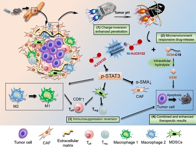 图2,本项工作设计的电荷反转式递药系统,可响应于肿瘤微酸微环境实现电荷由负变正的反转,实现深部穿透和色情网址大全递送;并在胰腺癌乏氧微环境下实现前药激活,用于抑制STAT3靶点,以协同与共负载的吉西他滨色情网址大全,最终同时达到逆转免疫抑制和解除耐药的目的。